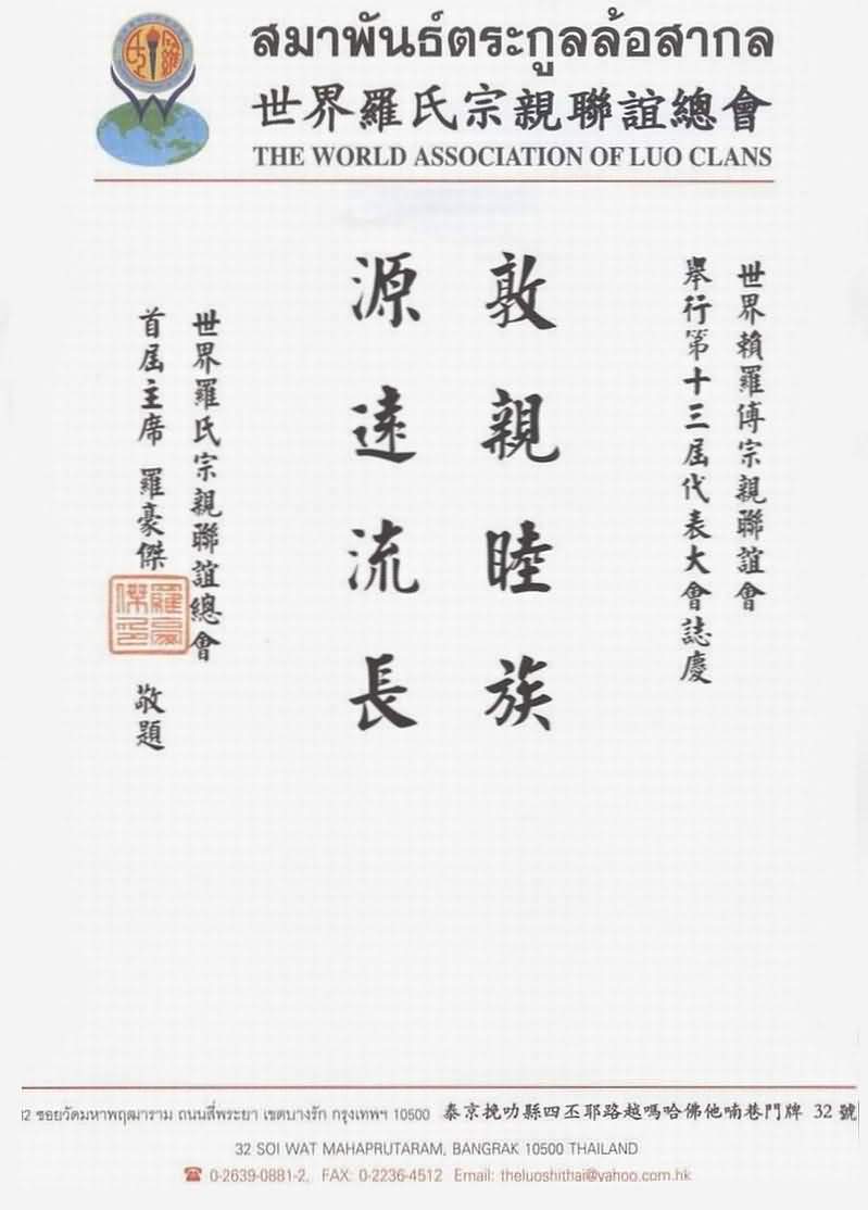 世界罗氏宗亲联谊总会首任主席罗豪杰题词